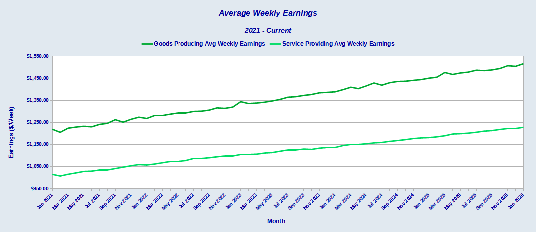 Between January 2025 and January 2026, nominal weekly earnings for goods producing jobs rose $65.56.