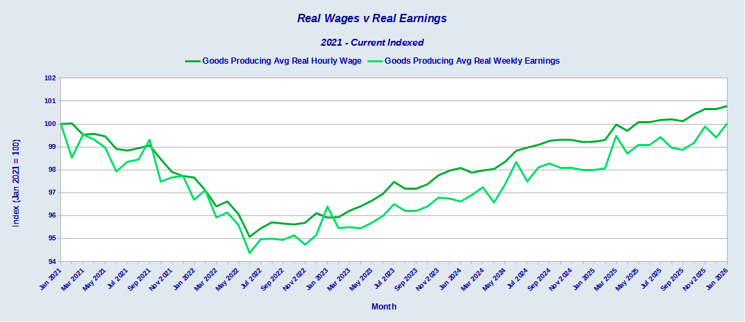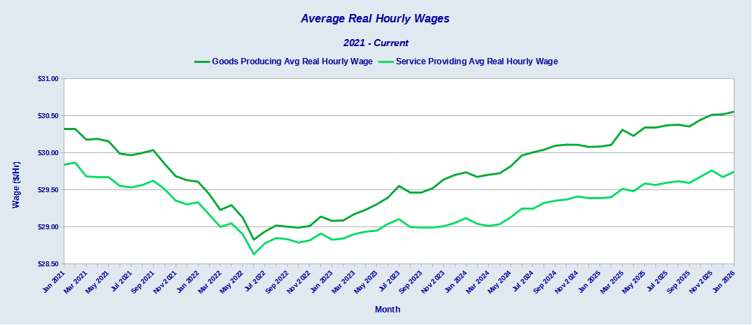 Between January 2025 and January 2026, average real hourly wages for goods producing jobs rose $0.47.