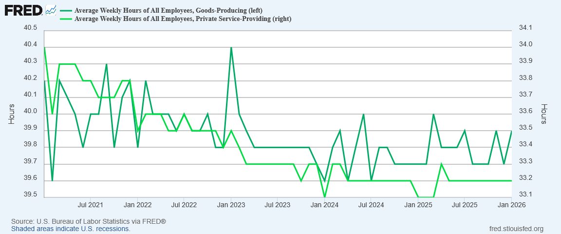 I’d like to highlight one thing that is largely the Democrats’ fault. You note that the average hours worked have declined “ with the greatest declines coming in service providing jobs.” I’m convinced that it’s been the Democrats’ policies on mandating increases in minimum wages that have resulted in hours of work lost. A restaurant or retail shop that has to increase hourly wages cannot hold prices down to where customers can afford them, and so has to cut back hours and reduce staff. They must make do with less. Entry-level workers, who are the most inexperienced and inefficient, are the ones who lose hours and employment opportunities.