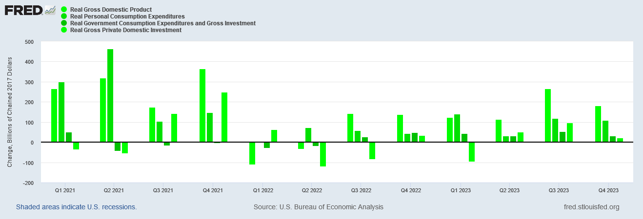 If we look at that same time frame for quarter on quarter changes in Real GDP, we see especially that Private Domestic Investment contracted and has staged a problematic “recovery” in 2023 at best.