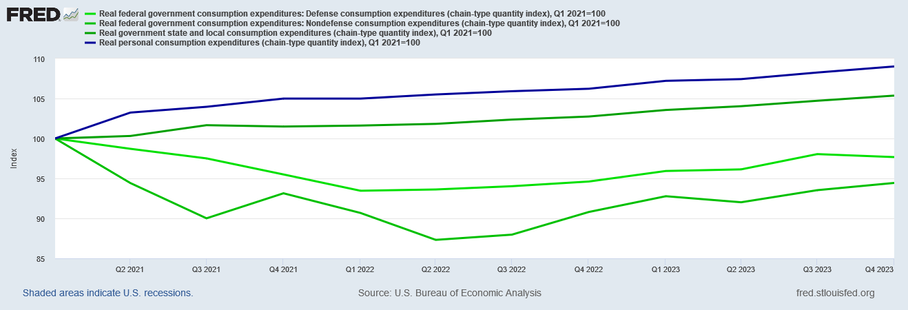If we look at consumption spending, indexed from the start of either 2017 or 2021, arguably the Biden economy shows the better performance of private consumption vs government consumption.