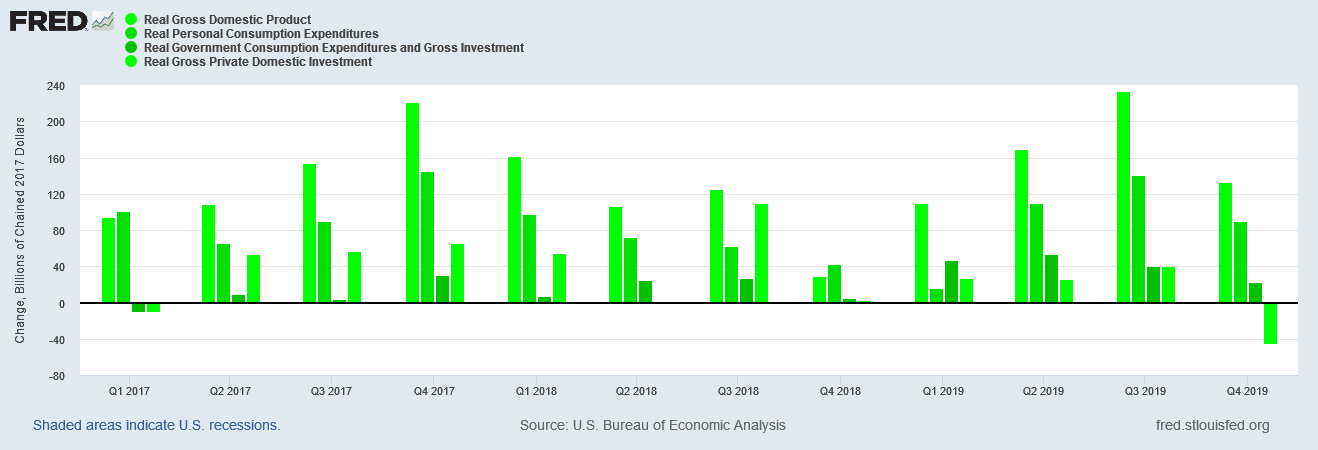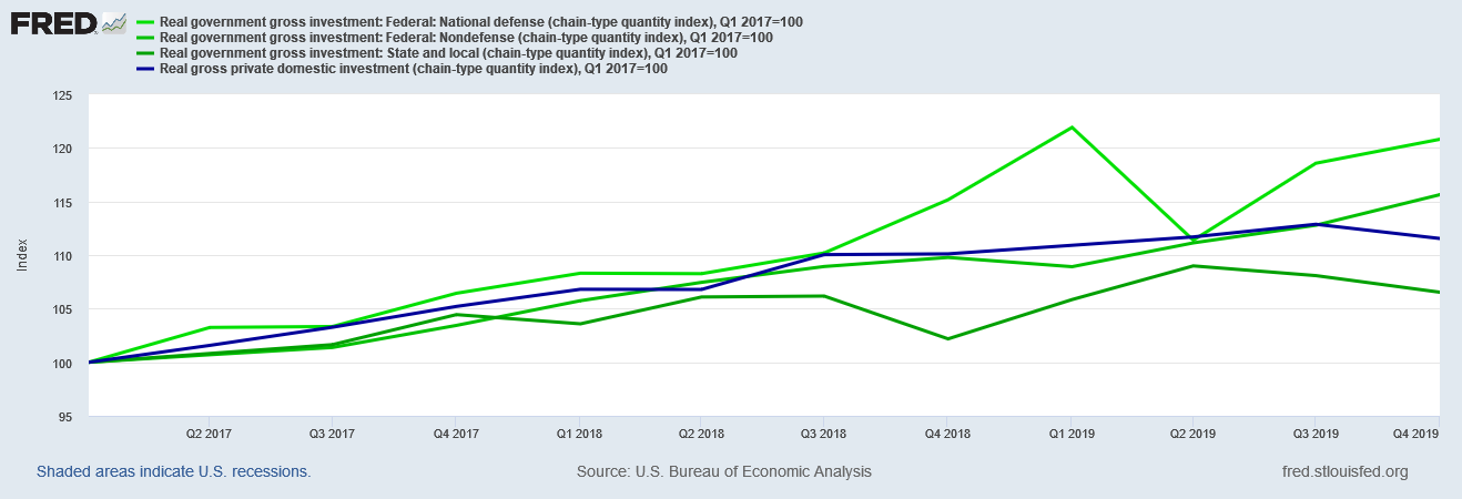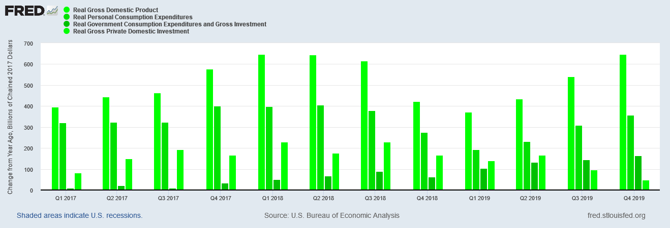 We should also note that, as Private Domestic Investment slowed, Government Consumption and Investment under Trump accelerated in 2019.
