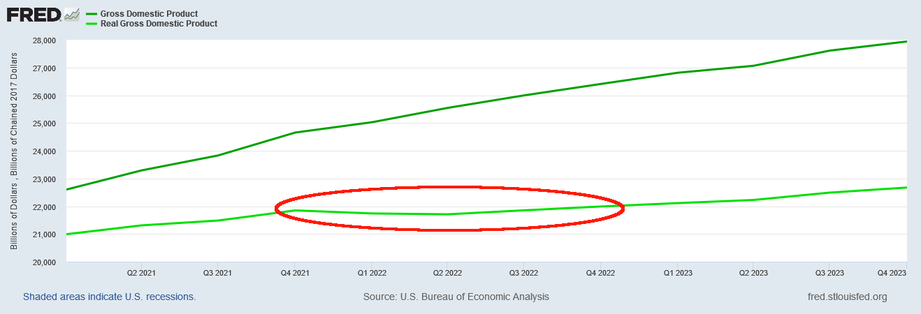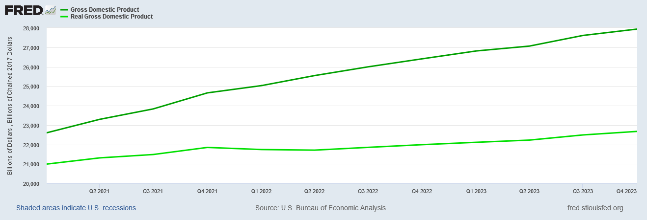 One of the first comparisons to make, one with some fairly obvious differences, is the growth in both nominal GDP and real GDP from 2017 through 2019 vs 2021 through 2023.
