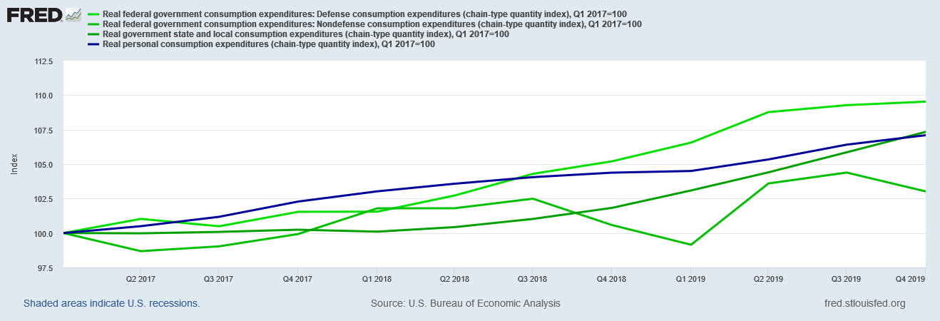 However, the one category of government consumption which first outpaced private consumption under Trump was defense-related consumption, with non-defense consumption spending declining through the first quarter of 2019.
