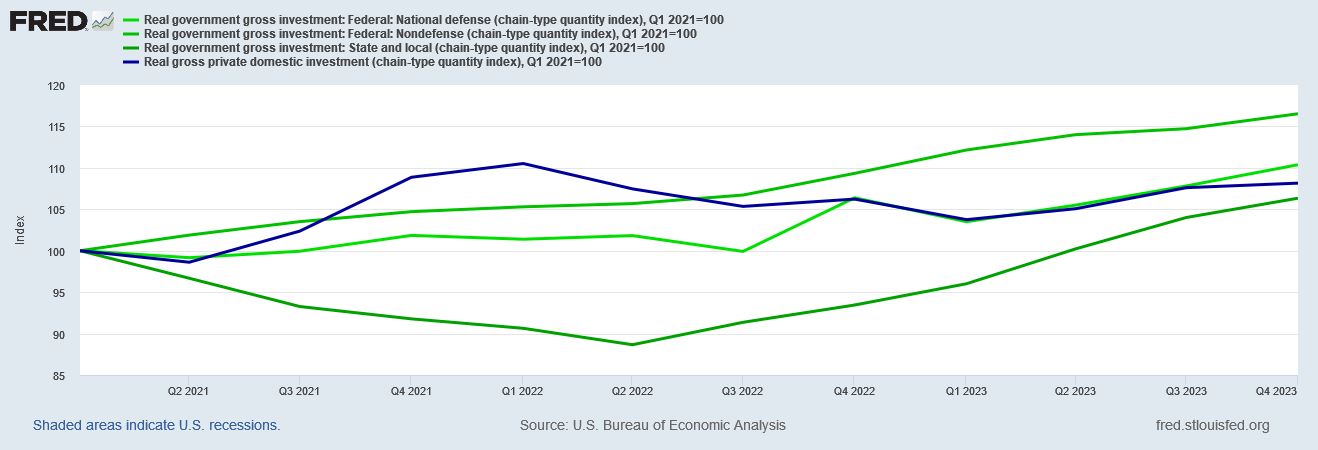 However, as with so many Presidents before him, including those notionally committed to fiscal restraint, Donald Trump was not shy about spending the public fisc. When private investment spending began to falter in 2019, Donald Trump’s administration stepped in with more government investment spending.