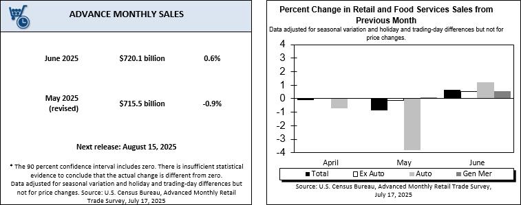 Advance estimates of U.S. retail and food services sales for June 2025, adjusted for seasonal variation and holiday and trading-day differences, but not for price changes, were $720.1 billion, up 0.6 percent (±0.5 percent) from the previous month, and up 3.9 percent (±0.5 percent) from June 2024. Total sales for the April 2025 through June 2025 period were up 4.1 percent (±0.4 percent) from the same period a year ago. The April 2025 to May 2025 percent change was unrevised from down 0.9 percent (±0.2 percent).