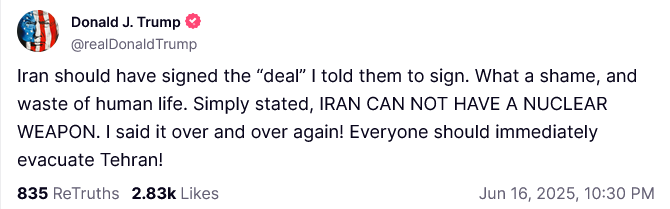 Could Tucker’s “all out war” scenario still take place? Yes. Israel is not rushing to give Iran a ceasefire, and a little while ago President Trump posted a cryptic warning on Truth Social encouraging everyone in Tehran to evacuate.