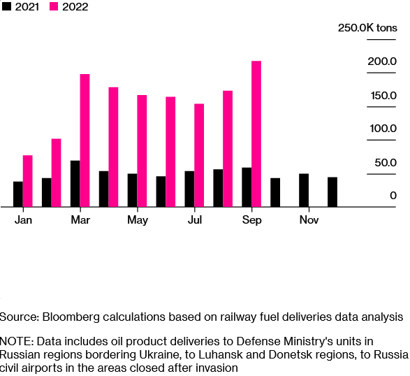 Gasoline, diesel and jet fuel deliveries to the Russian Defense Ministry’s units in six regions bordering Ukraine as well as the annexed Donetsk and Luhansk regions rose to almost 220,000 tons in September, according to Bloomberg calculations based on an analysis of railway data. That’s about four times the volume of a year earlier and exceeds shipments in March, the first full month after the invasion.