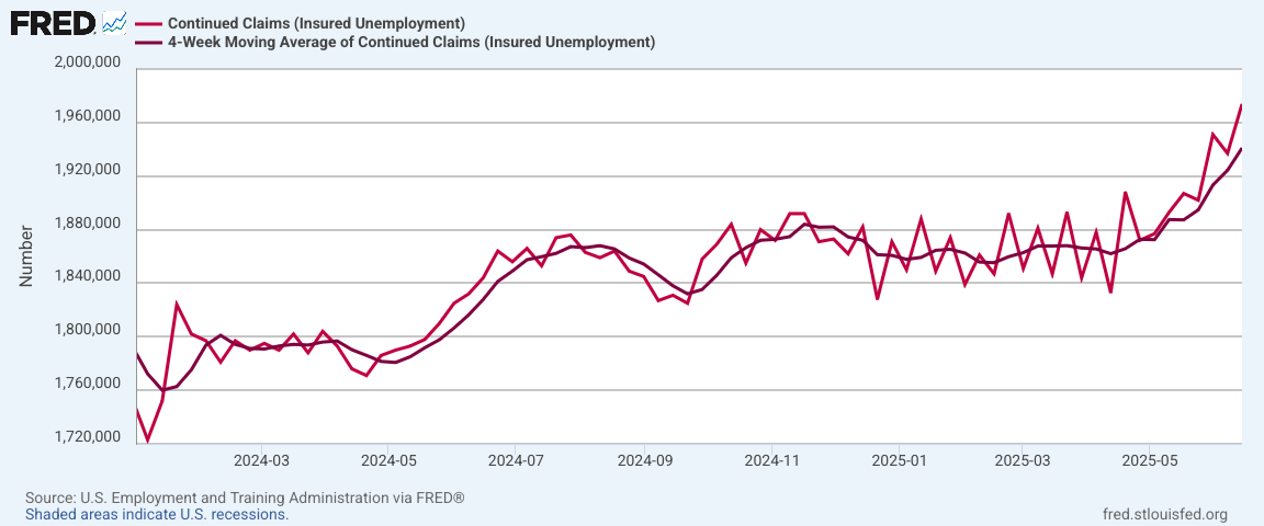 down by 8,000 from 1,945,000 to 1,937,000. The 4-week moving average was 1,941,000, an increase of 16,750 from the previous week's revised average. This is the highest level for this average since November 20, 2021 when it was 2,004,250. The previous week's average was revised down by 2,000 from 1,926,250 to 1,924,250.