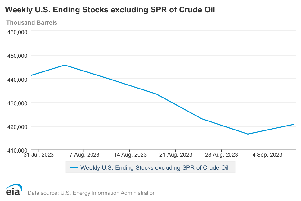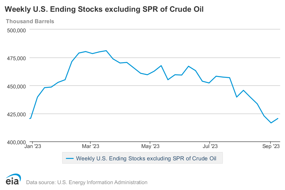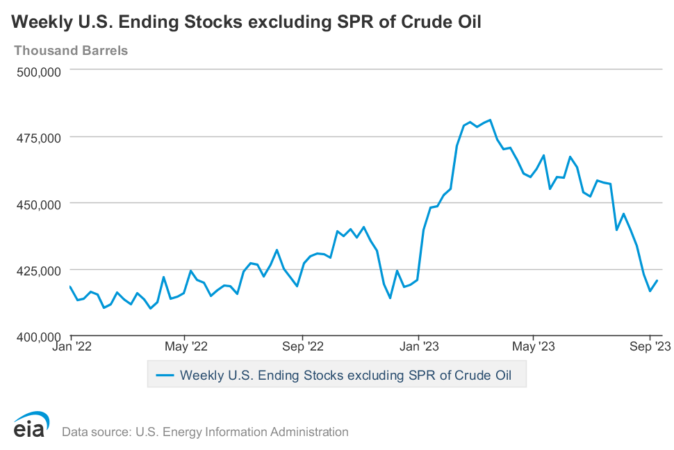 Indeed, when we look at crude oil inventories in the US since the beginning of 2022, we see that they were higher when the prices rises began at the end of June than they were in June of 2022, and that only recently have the inventory drawdowns brought inventories down to the levels of this time last year.
