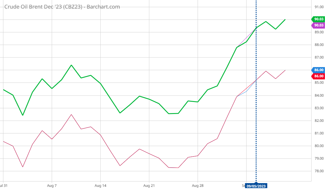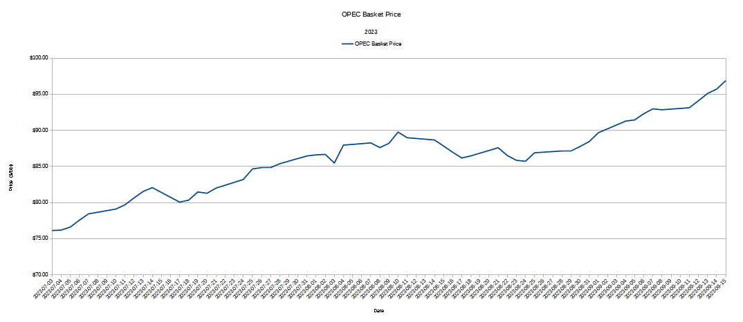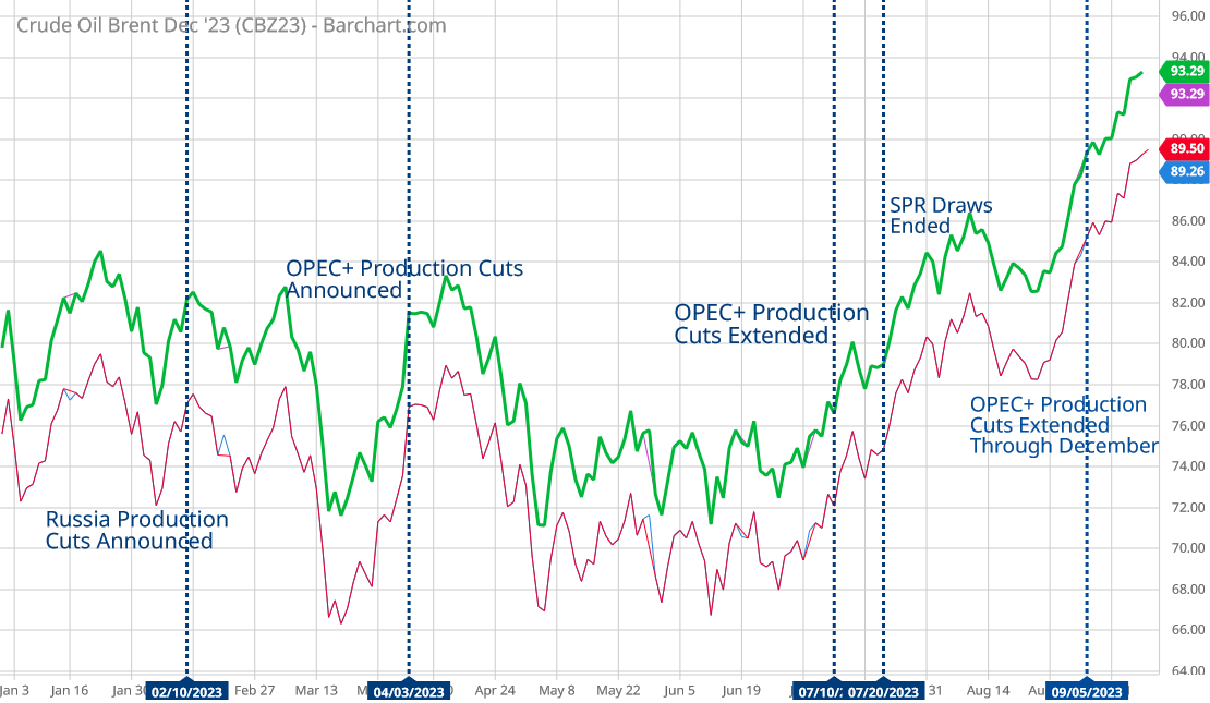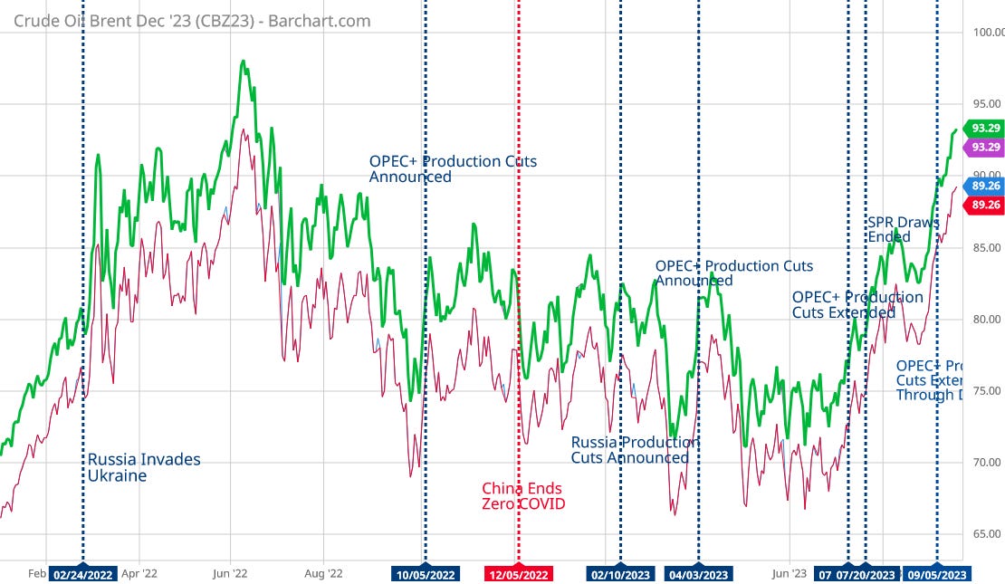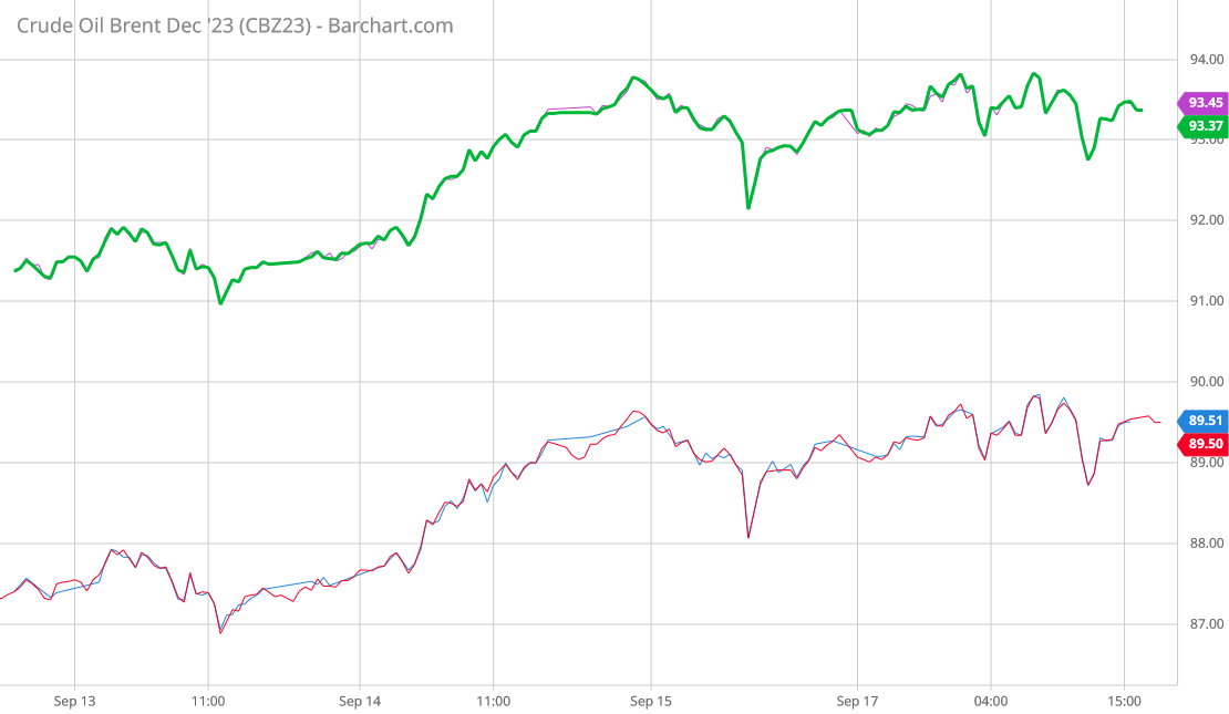 From after-hours trading on September 14 through September 18, the price for Brent Crude had oscillated just north of $93/bbl.