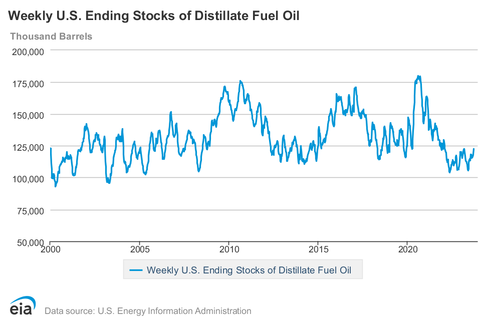 However, when we look more closely at inventory levels since the beginning of 2022, we see that current diesel stocks in the US are higher now than they were this time last year.