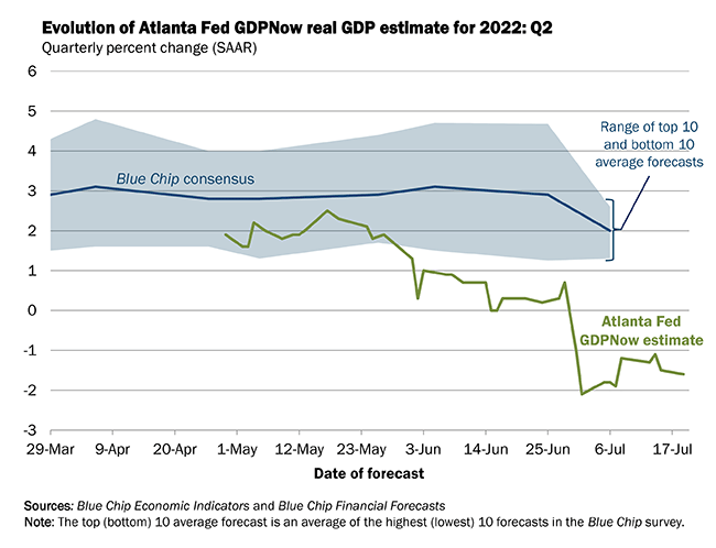 The GDPNow model estimate for real GDP growth (seasonally adjusted annual rate) in the second quarter of 2022 is -1.6 percent on July 19, down from -1.5 percent on July 15. After this morning's housing starts report from the US Census Bureau, the nowcast of second-quarter real residential investment growth decreased from -8.8 percent to -10.1 percent.