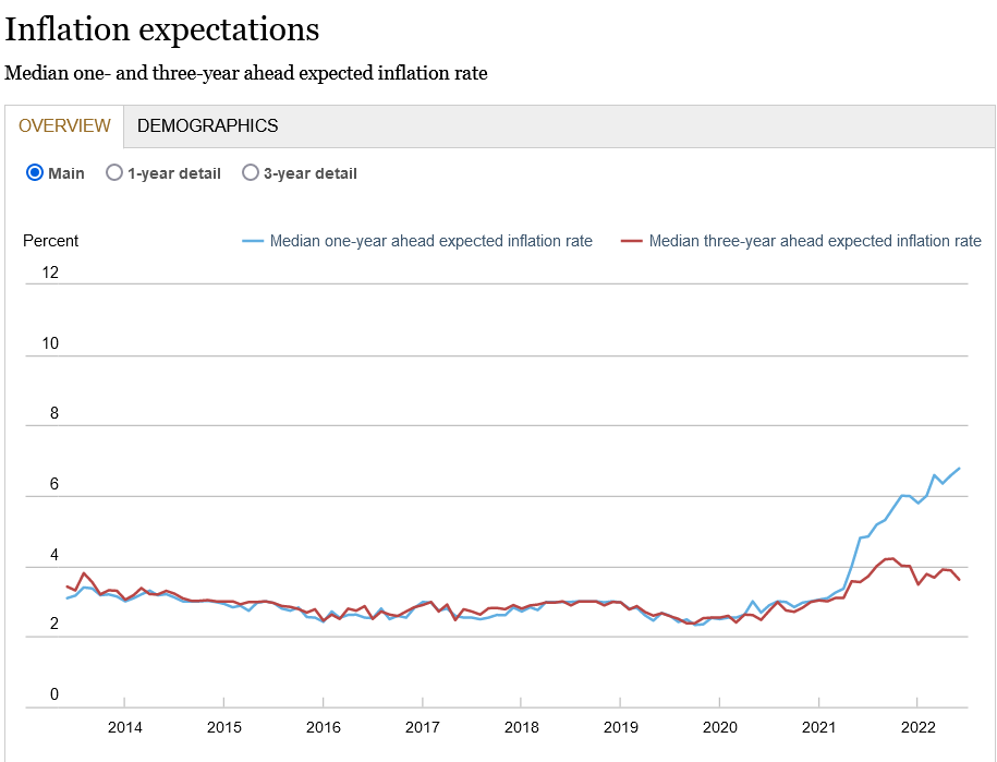 The median one-year-ahead inflation expectation increased to 6.8 percent in June, up from 6.6 percent in May, a new series high