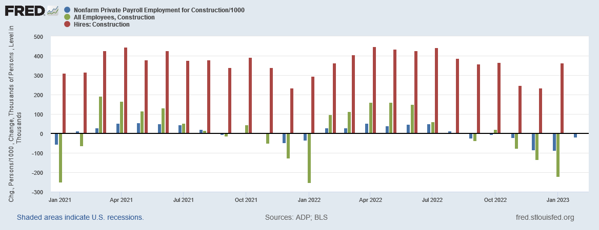 Wall Street’s fear over construction job loss also serves to illustrate one of the inherent dangers in relying too much on a single jobs metric. While the largely illusory construction job openings did drop significantly in the January JOLTS report, reported actual construction hiring printed at 362,000 (unadjusted)—while the ADP National Employment reported an unadjusted loss of 86,000 construction jobs and January Employment Situation Summary reported an unadjusted loss of 220,000 construction jobs.