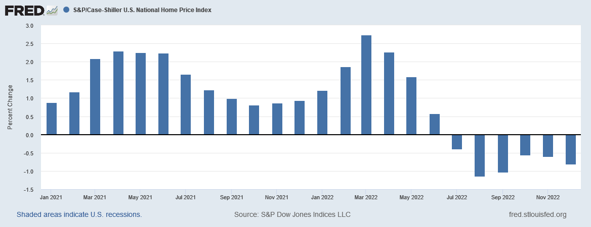 It is worth noting the most significant declines in home prices occurred around August and September, nearly two months before mortagage rates peaked near 7% for a 30-year mortgage.