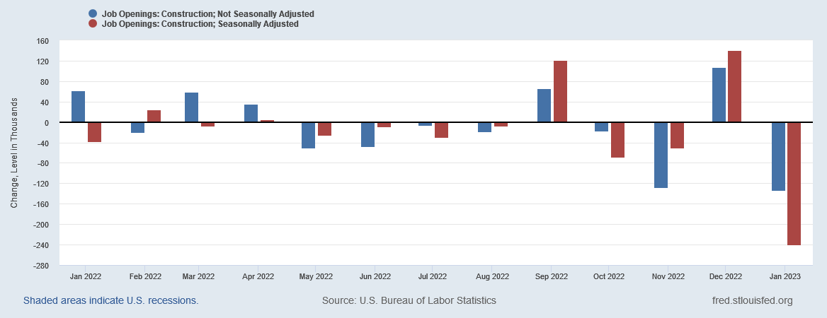 Part of Wall Street’s fear appears to come from the realization that the Fed’s campaign to boost interest rates boosts the costs of mortgages, which in turn boosts the cost of a house, which in turn suppresses sales, which in turn suppresses construction employment. At least, that is how Wall Street chose to interpret the “disappearance” of 240,000 construction job openings (as opposed to actual fulfilled jobs) from the January JOLTS report.