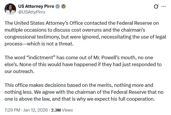 That’s where things get strange. According to Jeanine Pirro’s post on X, the US Attorney’s office contacted the Federal Reserve multiple times with questions and was ignored.