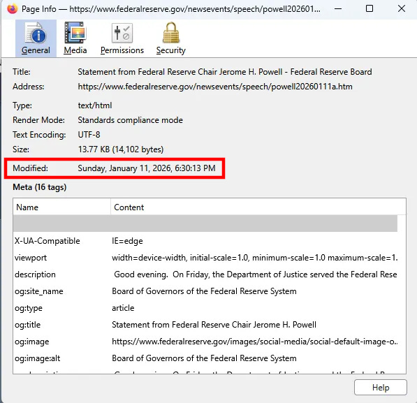 The video itself is remarkable if only for its timing. If we inspect the webpage properties from the link on the Federal Reserve website, we see that the page was modified on Sunday, January 11, 2026, at 6:30PM Central Time.