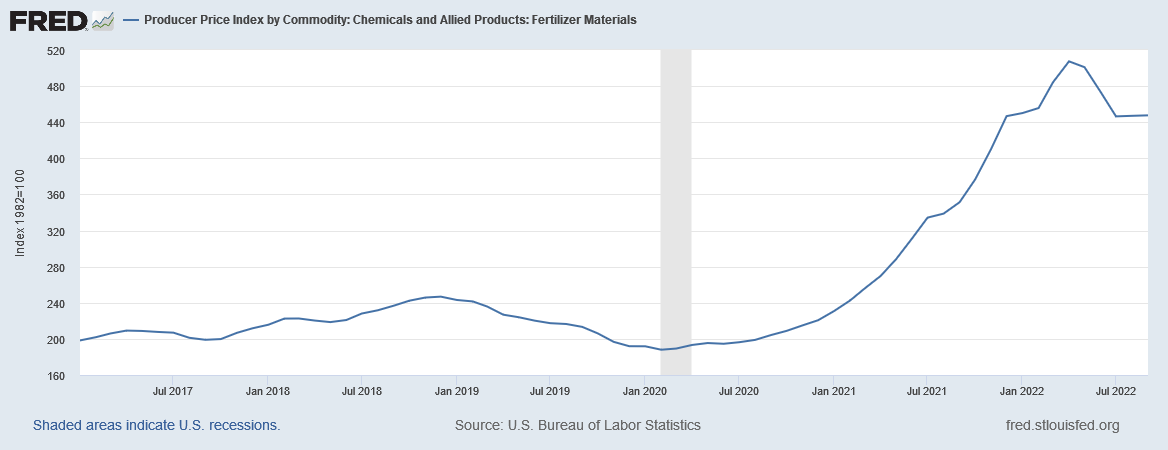 Nor is the price of fertilizer likely to come down, as the producer price index for fertilizer materials has also risen to similar extremes.