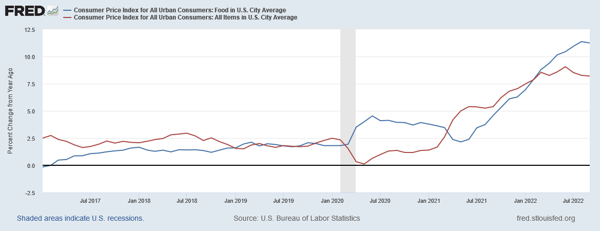 It is important to realize that, on the consumer end of the food production and supply chain, prices are still digesting a variety of supply shocks including an increase in fertilizer prices, with food price inflation as measured by the Consumer Price Index only just in September showing any decrease at all.