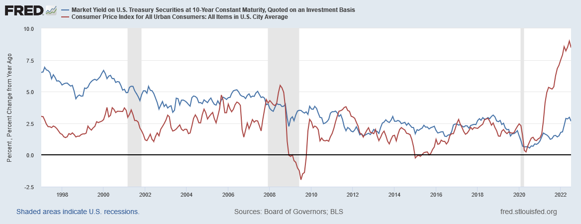 While it is problematic whether the Fed can raise rates sufficiently to be impactful against inflation, it is highly likely that the Fed needs to pursue higher interest rates as a matter of policy, just to have a hope of eventually getting Treasury yields above the rate of consumer price inflation. When interest rates are above inflation, there is some indication they act as a bulwark against inflation, and keep a rising inflation trend from taking hold in the economy; for that reason, it is an imperative that the Fed get interest rates above inflation—not just with a mind towards ending this inflation but also towards preventing future inflation.