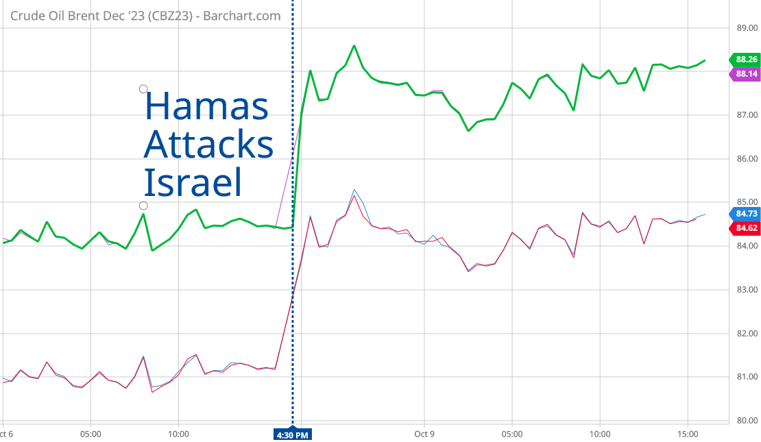 However, given the events roiling the Middle East since the weekend, today’s activity in oil trading is illuminating as to how markets are assessing the attack on Israel, as well as Israel’s ongoing response and retaliation against Hamas. Given that oil prices only last week dropped by more than $10/bbl, it is worth taking a moment to look at how oil markets behaved on the first trading day since the attacks began.