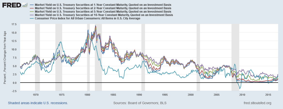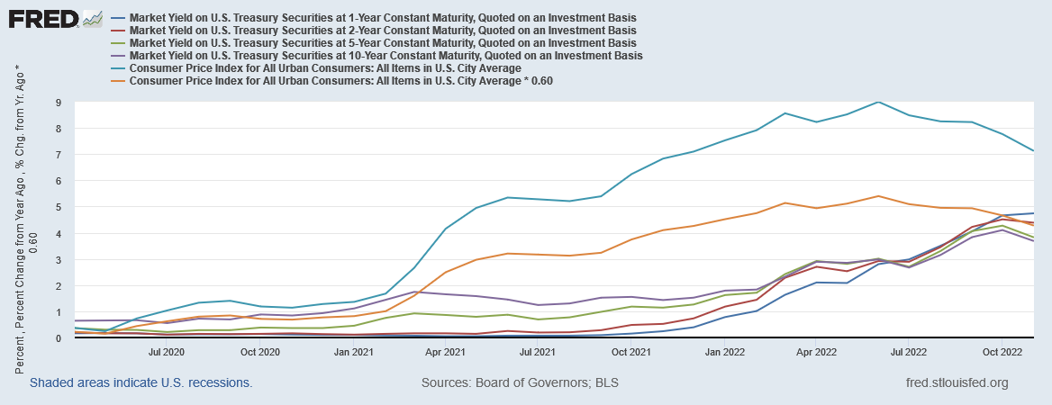 If we look at where market yields for various Treasury maturities are at currently, and compare them to the percentage rate equal to 60% of headline consumer price inflation, we see the lower-yield interest rates have already risen above where 60% consumer price inflation would be.
