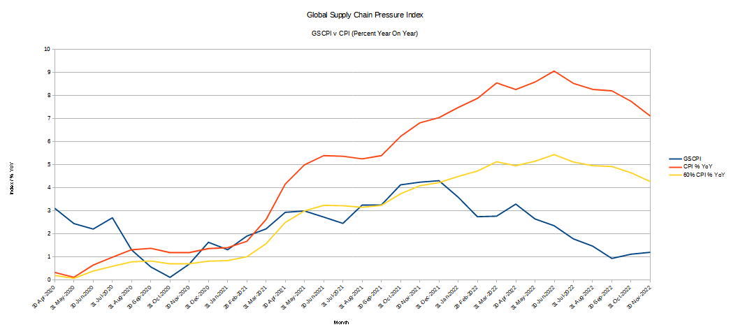 As di Giovanni only presents a summary of his model, I am unable to delve deeply into his analysis, but there are external metrics which tend to support his breakdown of inflation drivers. In particular, the Global Supply Chain Pressure Index, which amalgamates several supply chain indices such as the Baltic Dry Index for shipping rates, appears to track rather well with a 60% fraction of consumer price inflation during 2021.