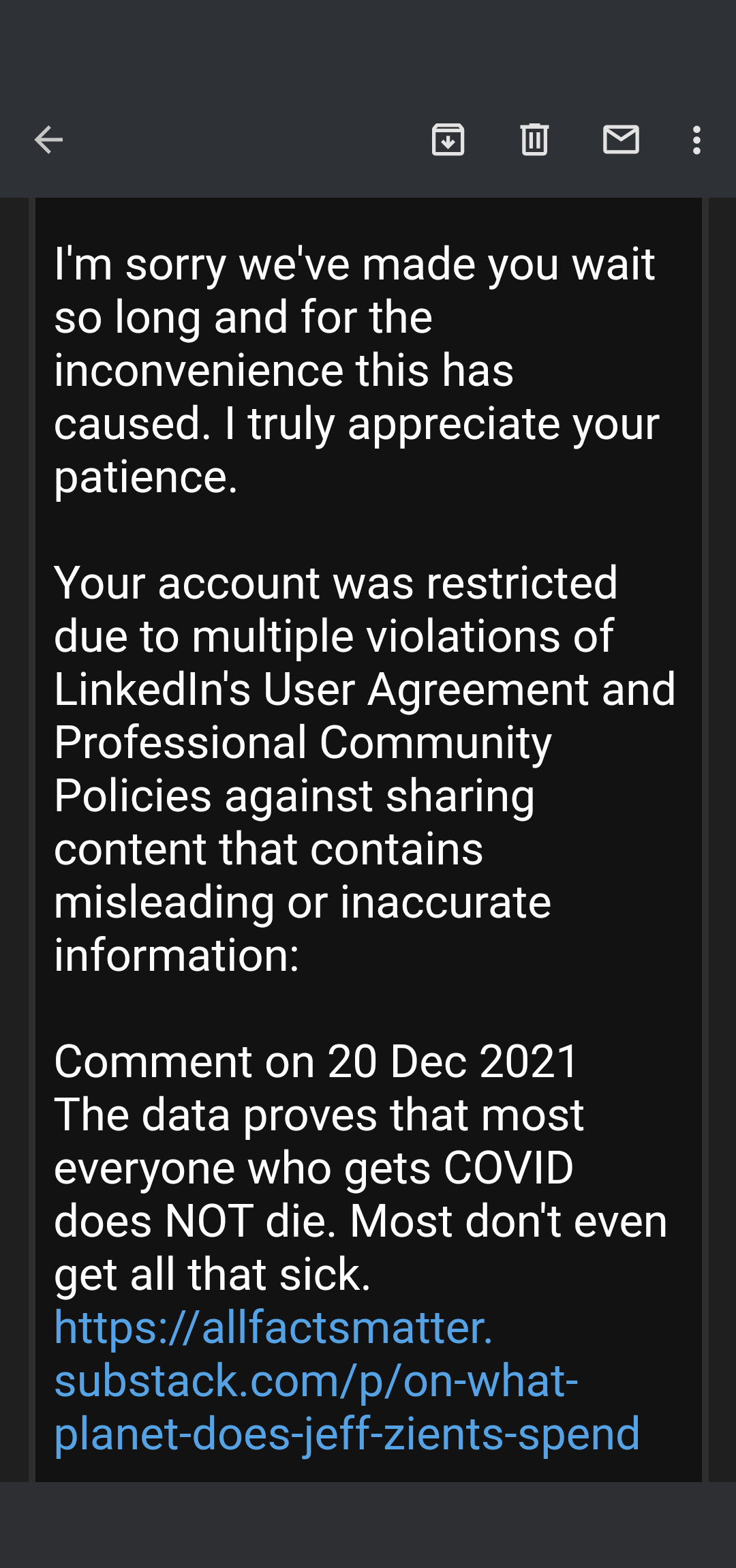 That I do not know—LinkedIn rarely says anything more substantive than “it's misinformation” with regards to its acts of censorship. Even so, the irony of that data-driven jeremiad possibly being the cause of this latest suspension amply warrants this article's headline.