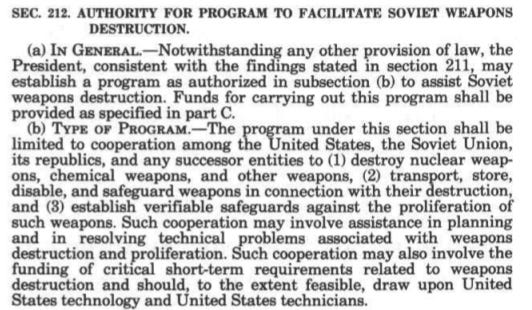 The initial premise of threat reduction was that the weapons and related infrastructures should be destroyed, dismantled, or converted to civilian “peaceful” use as appropriate. The program authorization (Section 212 of the Act) explicitly describes programs of weapons destruction.