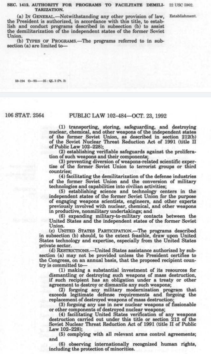Ukraine’s accession to the Biological Weapons Convention as part of the Soviet Union was sustained through its transition to an independent state, obligating it once independent to immediately destroy its stores of bioweapons and dangerous pathogens used to create bioweapons, and to dismantle the infrastructure used to produce both. Research facilities and personnel were required, per the BWC, to be immediately redirected towards benign, beneficial, peaceful purposes. Despite US assistance, which began even as the Soviet Union was still formally dissolving in late 1991, these obligations were demonstrably unmet in 2005; the agreement to fund Ukrainian nonproliferation efforts directly through CTR is absolute proof of this.