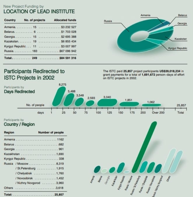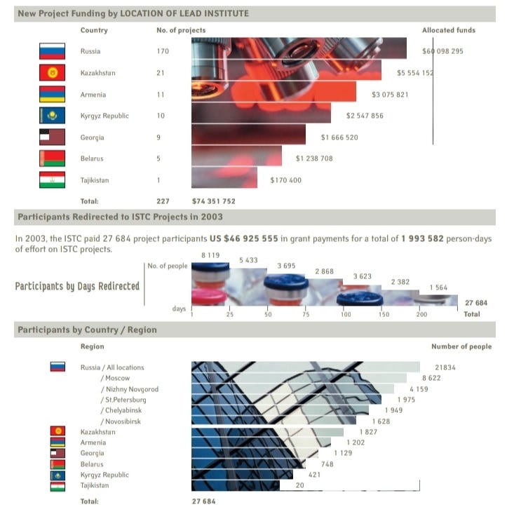 With this authorization in hand, the US set up the International Science And Technology Center, headquartered in Moscow, with the stated intention of putting former Soviet WMD scientists to work in “peaceful employment”.