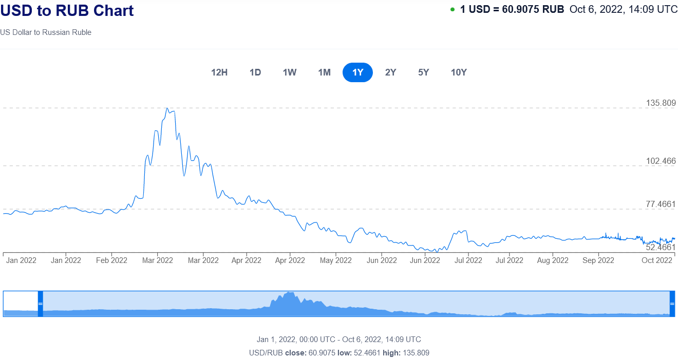 Even though the ruble is still stronger now than before the war began, the dollar’s slide against the ruble bottomed out back in July, and the dollar has been steadily strengthening ever since. A stronger dollar/weaker ruble increases Russia’s need for foreign currency—foreign currency it apparently does not have, at least not on a reliable basis.
