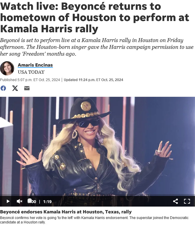 Kamala Harris supporters waited for more than 12 hours to see the superstar at a Houston rally Friday night. Instead of hearing the superstar sing "Freedom," which is now inextricably connected to Harris' campaign through her first campaign video ad and which is blared at rallies, they listened as Beyoncé gave a moving endorsement for the presidential candidate.