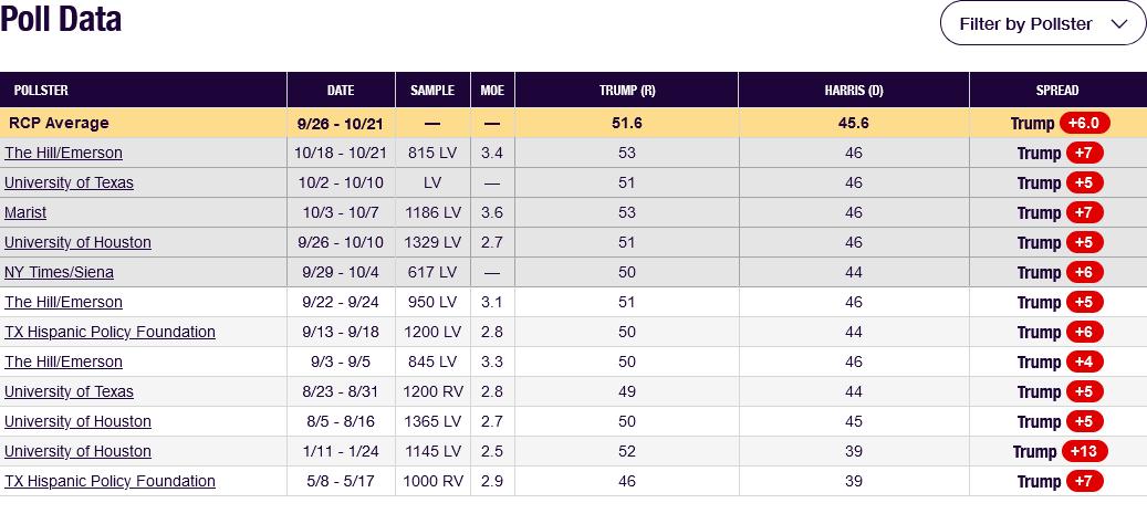 Remember, this is Texas—a state which has long been a Republican stronghold. While Democrats are striving mightily to turn the state blue, this is not the election where that will happen. Not one single poll in the RCP aggregate has ever showed Kamala Harris to be even within striking distance of winning the state.