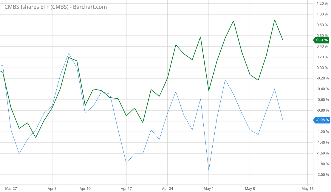 Nor is it merely REITs. ETFs for Commercial Mortgage-Backed Securities have since March outperformed their residential mortgage counterparts.