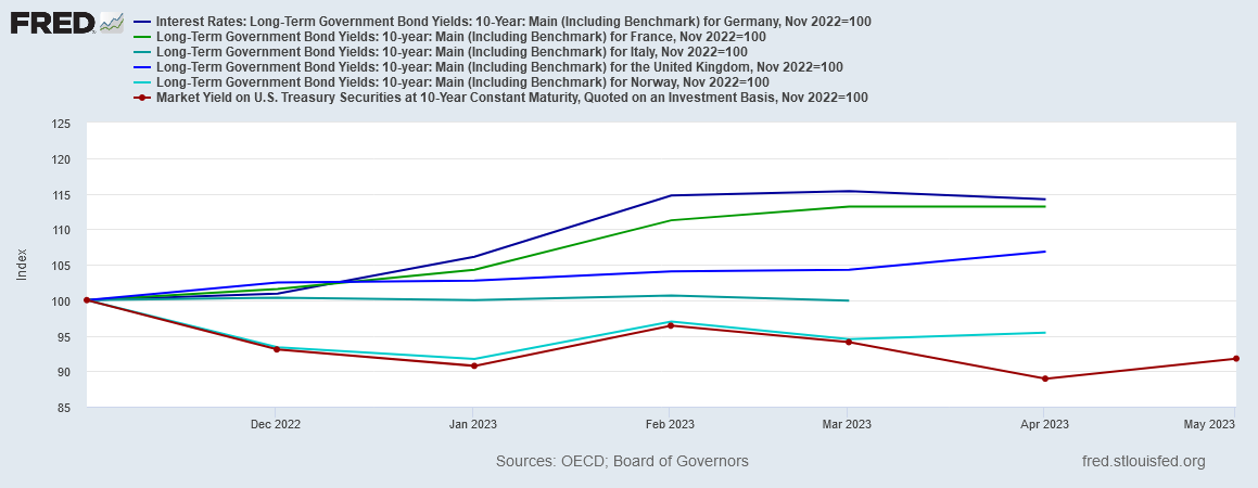 While in Germany and France, yields have risen somewhat over the past six months, in the US and Norway, yields have actually declined relative to where they were in November, 2022.