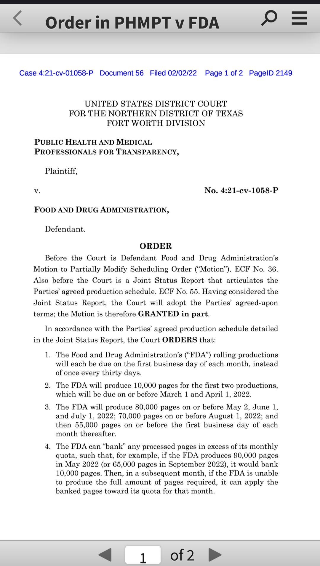 The courts are letting the FDA off the hook by releasing just 20,000 pages of Pfizer clinical trial data between now and April 1.