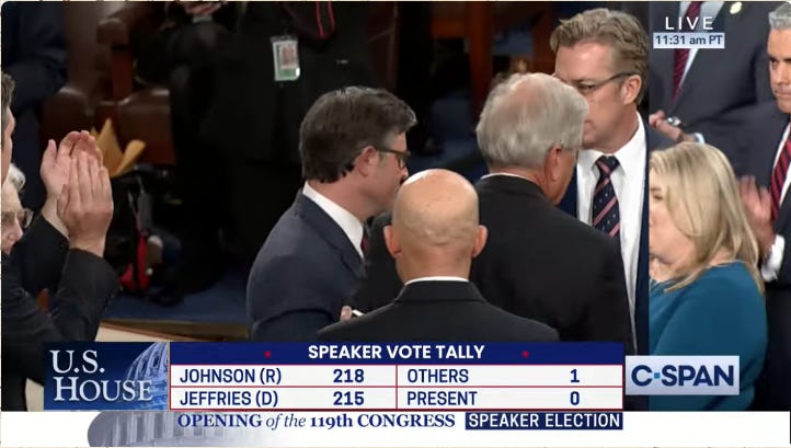 I don’t like the idea of a Speaker Johnson. I like the idea of a Speaker Jeffries a whole lot less. I watched the Speaker voting on CSPAN, and I listened to the full roster of candidates nominated for the position of Speaker: Mike Johnson and Hakeem Jeffries.