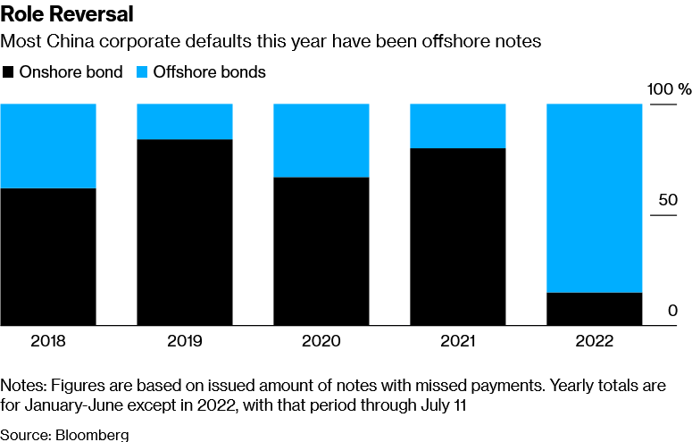 For the most part, the financial fallout from China’s collapsing property bubble has been concentrated among overseas investors. 2022 has been remarkable in that most corporate bond defaults in China have been among its portfolio of offshore bonds.