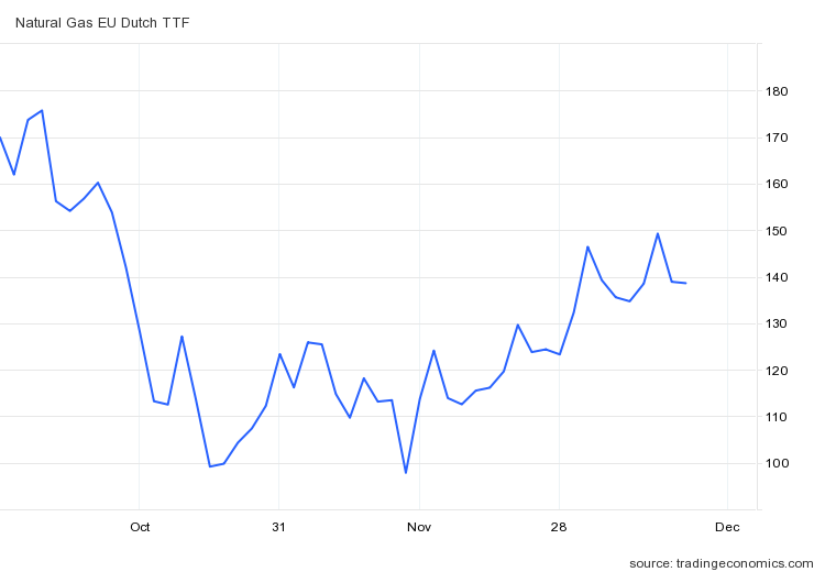 As of December 8, the UK’s crisis index was at 29 (higher means greater crisis), with gas prices at €59 per Mw/H and electricity prices at €165 per Mw/H.