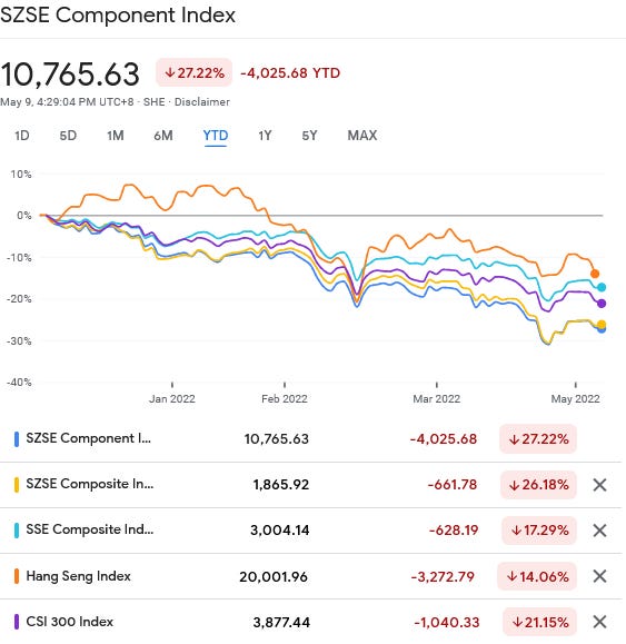 China’s financial markets reflect the mordant state of the Chinese economy, with all the major stock indices posting double-digit declines since the start of 2022.