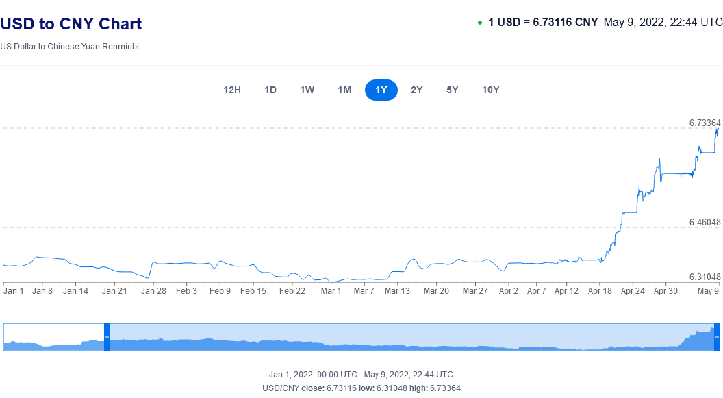 China’s flagging economy is also being reflected globally, as the lockdown periods coincide with a dramatic weakening of the Chinese yuan against the US Dollar.