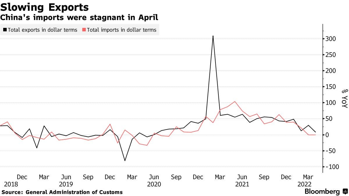 Export growth in April slowed to 3.9% in dollar terms from a year earlier, compared to an increase in March of 14.7%, customs data showed Monday. That’s the weakest pace since June 2020 but faster than the median estimate of a 2.7% gain in a Bloomberg survey of economists.