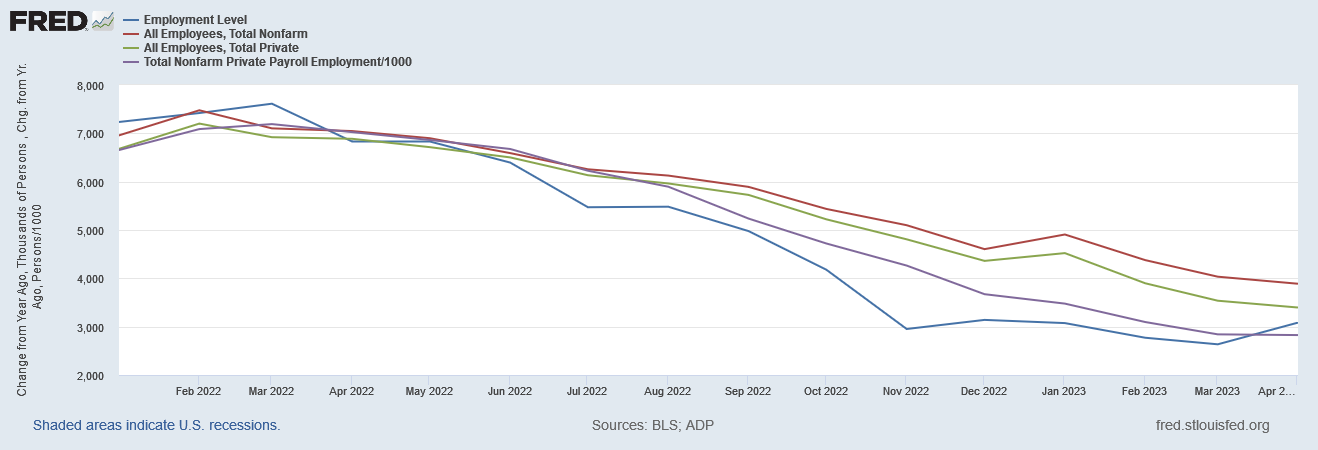 Yet even at that, all the jobs metrics are showing a steady slowing of job growth from early 2022 onward. Far from “surging”, job growth in this country has been slowing down since at least March of last year.