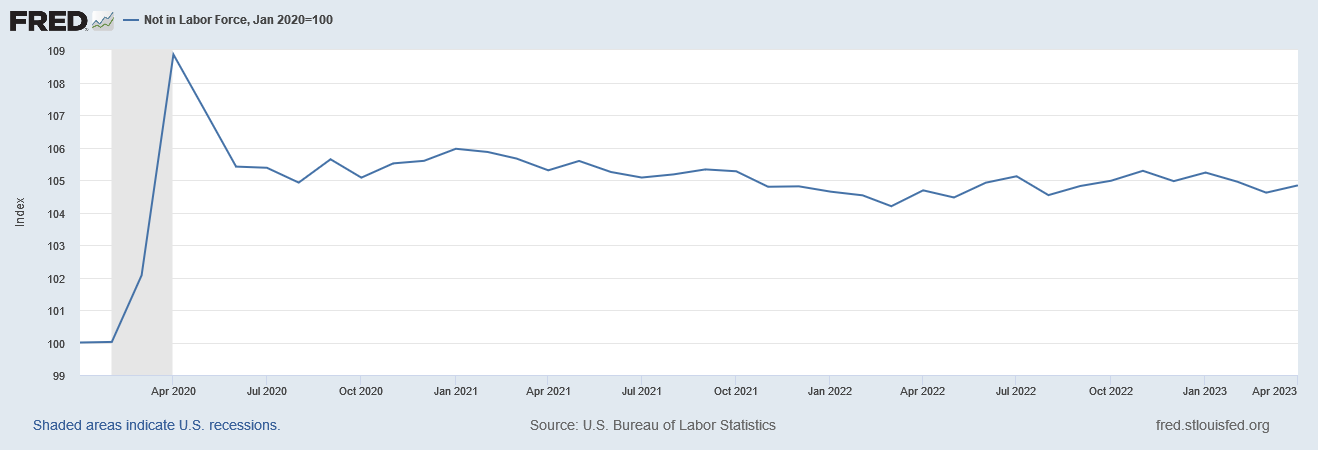It’s an even worse thing that the seasonally adjusted number of persons not in the labor force rose by 214,000 month on month—more workers exited the labor force than came off unemployment durng the month (182,000 seasonally adjusted).
