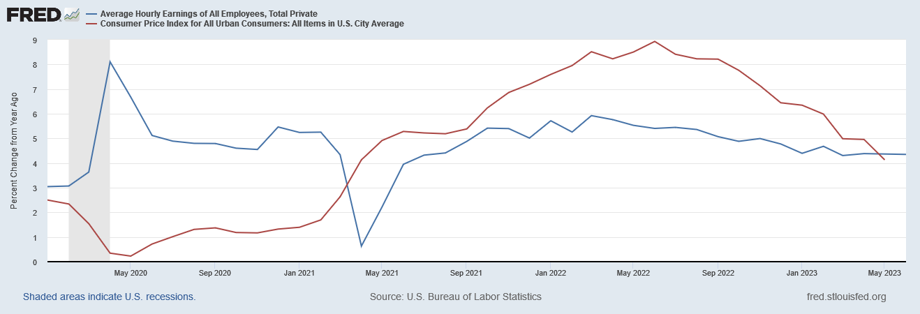 May was the first month that inflation printed lower than increase in average hourly wage since March of 2021.