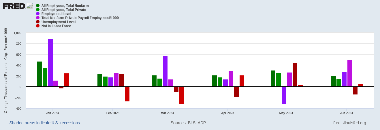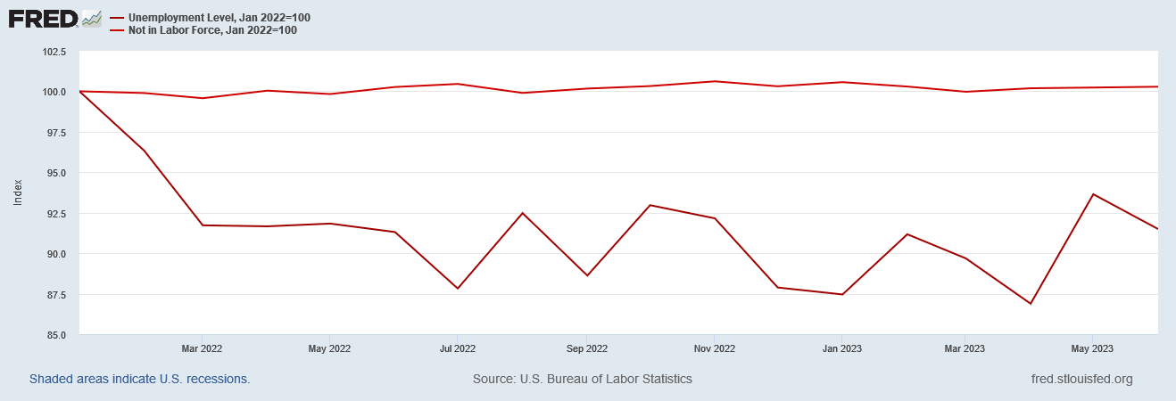 With a marginal increasing trend for the “Not In Labor Force” demographic, this is not a comforting trend, even though there is also a downward trend since the beginning of 2022 for the number of unemployed.