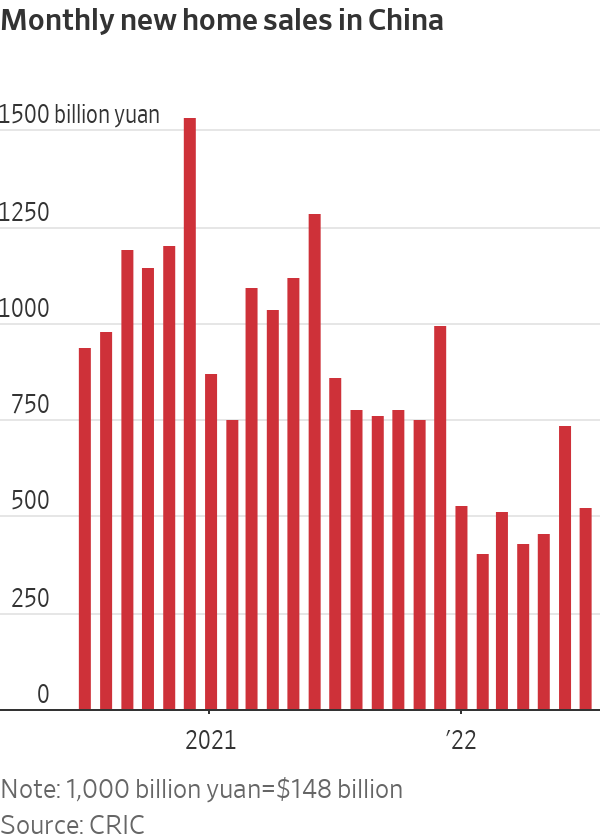 Sales at the country’s top 100 property developers fell 39.7% in July from the same period last year to the equivalent of $77.6 billion, or 523.14 billion yuan, according to data released Sunday by CRIC, a Chinese real-estate data provider.